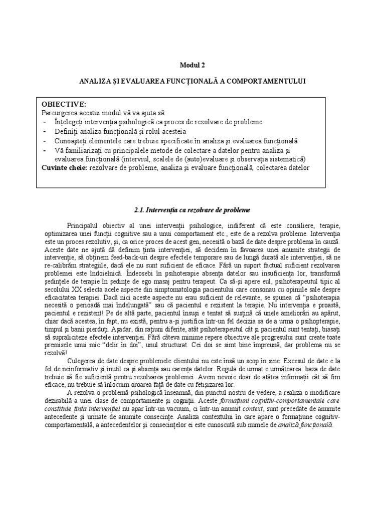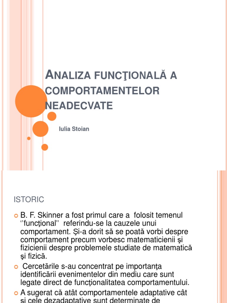 La sfârşitul anilor1970 şi la începutul anilor 1980 se fac primii paşi către crearea unui protocol pentru analiza funcţională a comportamentului pentru persoanele cu tulburări în dezvoltare de atunci protocolul procedura a fost perfecţionată după sute de studii şi cercetări şi devine parte a analizei aplicate a comportamentului. Analiza functionala a comportamentelor. 0 stele 0 review uri. 10 mai 2017 08 58.