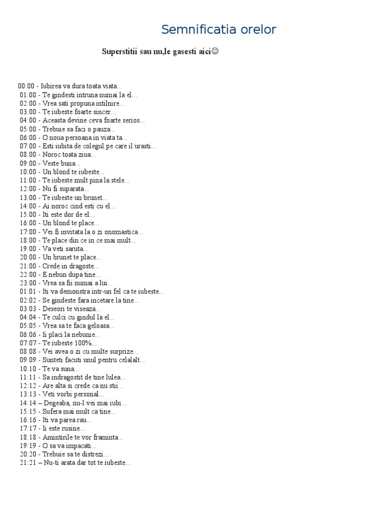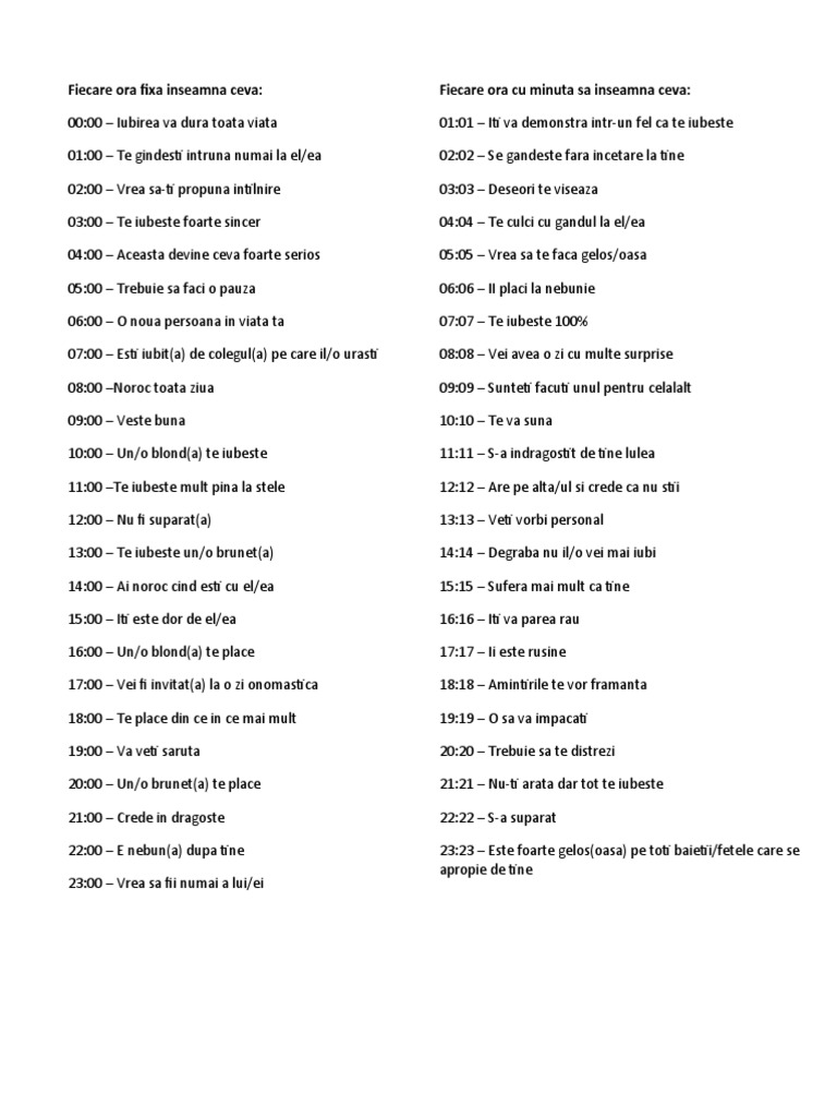 00 00 iubirea va dura toata viata 01 00 te gindesti intruna numai la el ea 02 00 vrea sa ti propuna intilnire 03 00 te iubeste foarte sincer 04 00 aceasta devine ceva foarte serios 05 00 trebuie sa faci o pauza 06 00 o noua persoana in viata ta 07 00 esti iubit a de colegul a pe care il o urasti. Există altcineva care ar face orice pentru a fi cu tine dar se ascunde. S a hotărât să te ceară în căsătorie și așteaptă momentul potrivit. Ora 4 ai noroc.