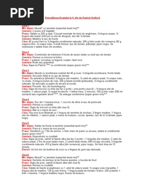 Detoxifierea ficatului în 9 zile. Acesta recomandă cinci mese pe zi trei principale și două gustări și consumarea a minimum doi litri de apă împărțiți în doze egale pe tot parcursul zilei. Ficatul este unul dintre cele mai complexe organe și are foarte multe funcții importante. în această perioadă există alimente care trebuie consumate zilnic dar şi aşa cum era de aşteptat alimente interzise.