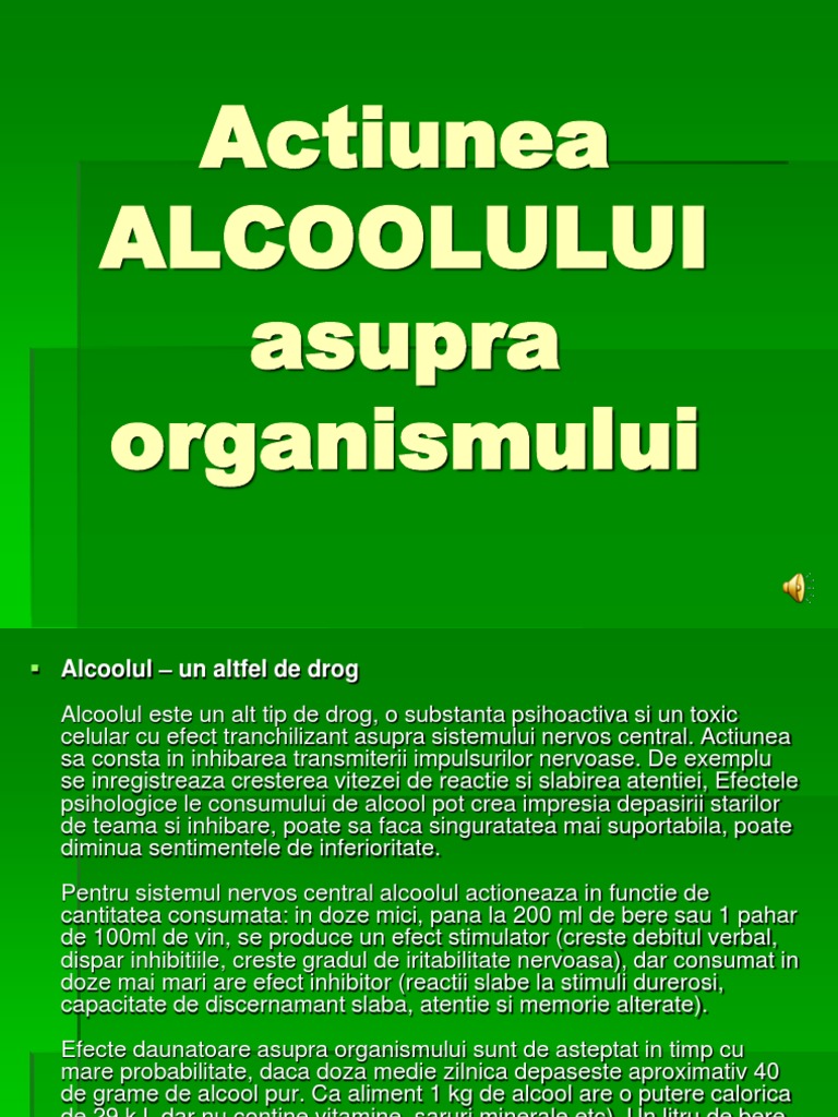 Efectul asupra sistemului nervos centra apare cel mai timpuriu dar apoi toate organele sunt afectate de alcool circa 90 din cantitatea de alcool din organism este transformată în şi este eliminat sub această formă din organism. Efectele consumului de alcool asupra organismului de cele mai multe ori consumarea de bauturi alcoolice nu cauzeaza probleme dar consumarea lor peste limita poate fi da. în cele ce urmează voi încerca să vă conving de efectele nocive ale unui consum. Alcoolul incetineste functionalitatea sistemului nervos central.