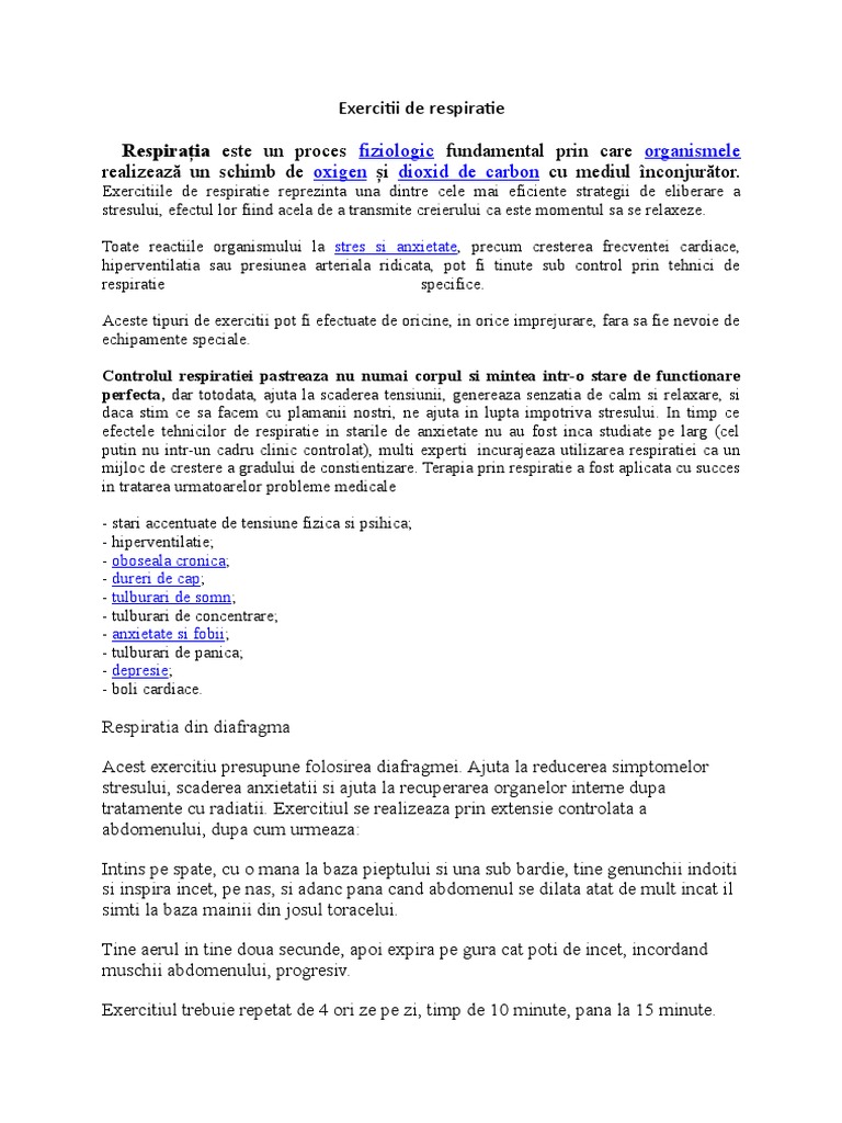 Foarte multe persoane sunt afectate de anxietate zi de zi. Retrage te intr un loc linistit atunci cand practici acest exercitiu poate fi vorba despre un colt al unei incaperi sau despre toaleta unui loc public important e sa ai parte de putina liniste. Din fericire exista o multime de modalitati de a elimina stresul fara a apela la masajele din centrele spa. Respiratia abdominala se realizeaza prin coborarea diafragmei si umflarea abdomenului.