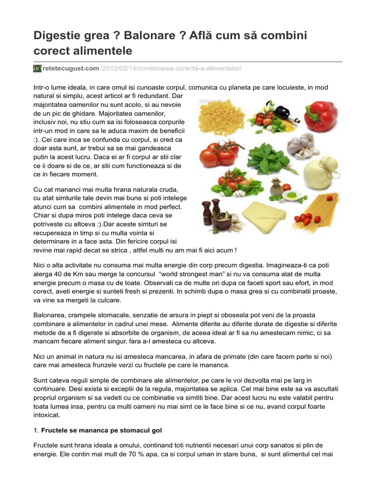 Nu manca la ore tarzii deoarece sistemul digestiv este incetinit seara iar toata mancarea va sta in stomac pana cand sistemul se va pune in miscare. După ce ajunge în stomac mâncarea se amestecă cu acidul gastric. De asemenea nu se recomandă combinarea produselor care au diferit timp de digestie. Digestia completă a alimentelor durează între 24 şi 72 de ore şi depinde de mai mulţi factori inclusiv tipul de mâncare consumat şi prezenţa problemelor digestive.