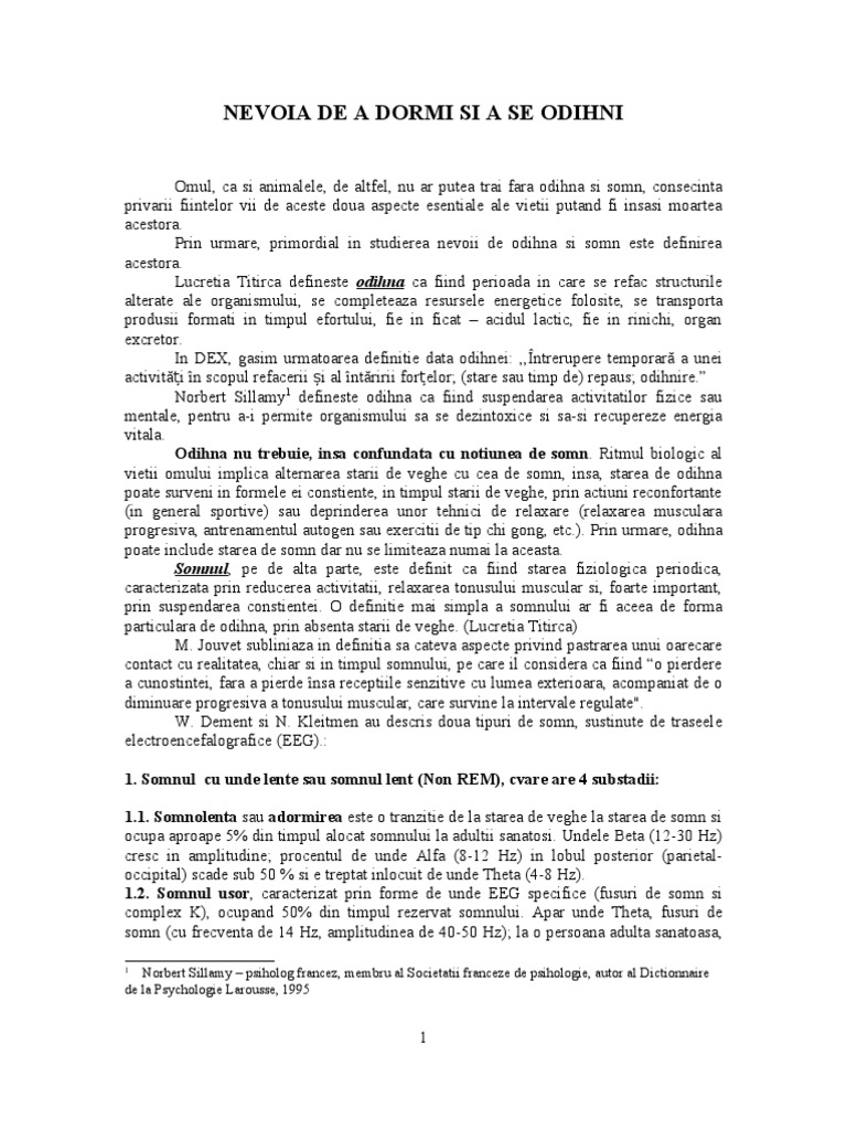Nevoia de a dormi si a se odihni. Arhiva contine 1 fisier doc de 44 de pagini. Prin urmare primordial in studierea nevoii de odihna si somn este definirea acestora. I independenta in satisfacerea nevoii. Nevoia de a dormi si a se odihni.