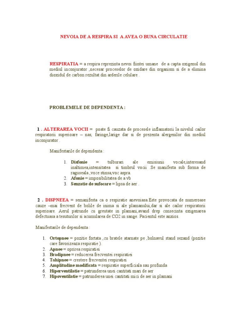 Ortopnee bradipnee tahipnee tuse hemoptizie mucozitatii amplitudine modificata hipoventilatie. Nevoia de a respira si a avea o buna circulatie. A comunica comunicare deficitară sau incapacitate de a relata datorată tulburărilor funcţionale respiratorii şi fenomenelor obstructive. Independenţa în satisfacerea nevoii de a respira este determinată de.