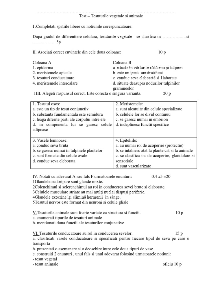 Test Biologie Tesuturi Vegetale Si Animale Clasa A X A