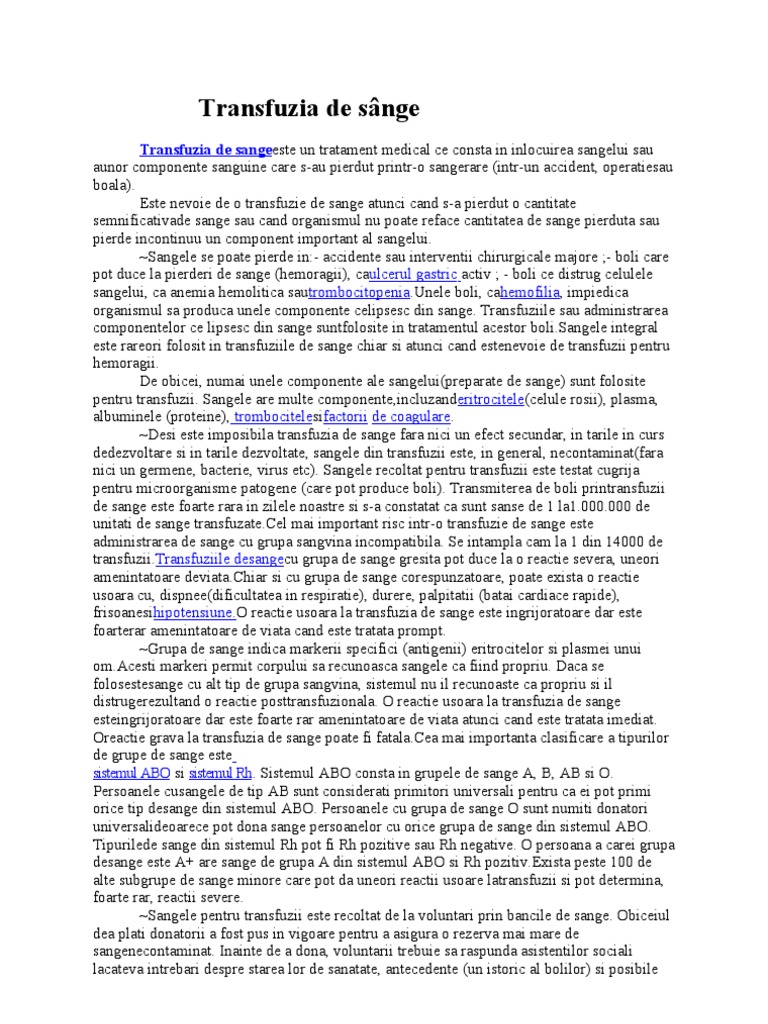 Transfuzia de sange referat. Unele boli ca hemofilia impiedica organismul sa produca unele componente ce lipsesc din sange. Transfuzia este o metodă activă de tratament biologic ce introduce în sistemul circulator al unui bolnav sânge şi sau derivate de sânge plasmă concentrat leucocitar eritrocitar sau plachetar derivaţi de plasmă etc cu scopul compensării deficienţelor hematologice generate de dezechilibrul producţie versus pierdere. în secolul xvi papa innocent al viii lea a urmat un asemenea tratament. E ceva ce putem numi donare de sânge.