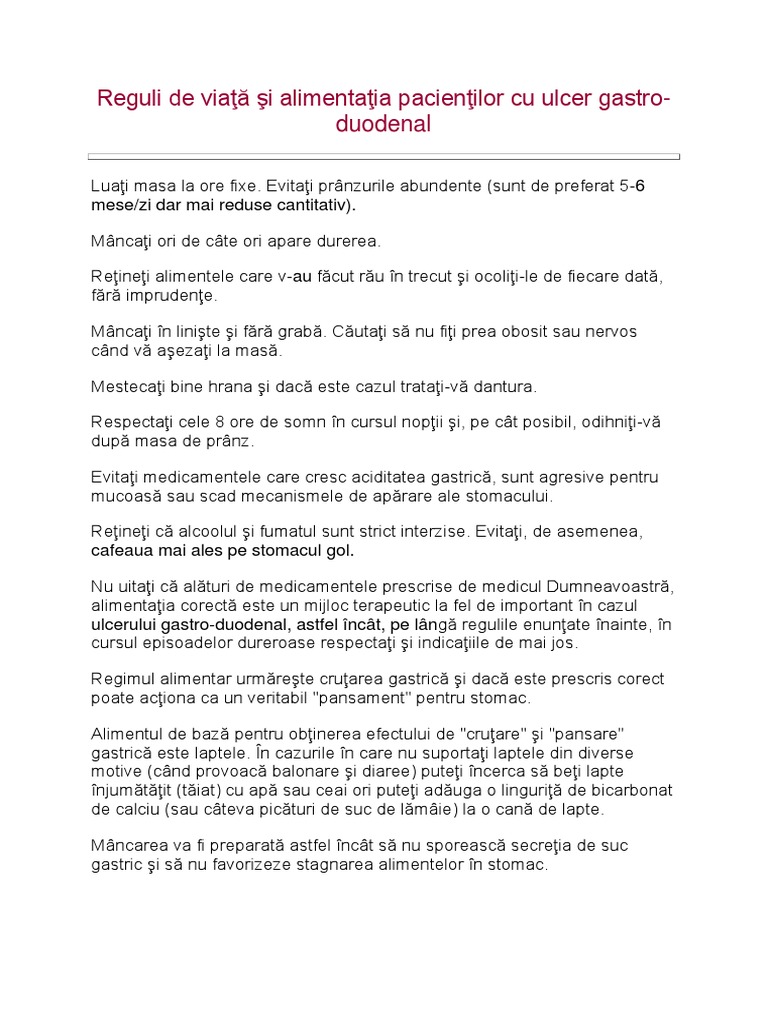 Ulcer duodenal regim alimentar. Reguli de viaţă şi alimentaţia pacienţilor cu ulcer gastro duodenal. Lista alimentelor permise în regimul bolnavilor de ulcer. Regimul alimentar corect cel mai bun remediu al durerilor ulceroase. Regim alimentar recomandat in caz de ulcer duodenal.